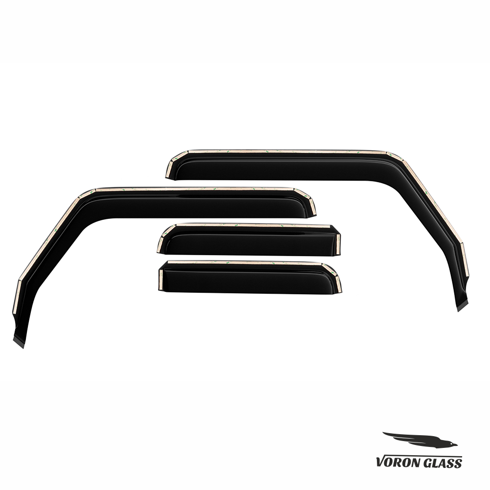 Voron Glass window deflectors brand are our lower-cost alternative to high quality, stylish window deflectors. Voron Glass window air deflectors are made with strong acrylic material to protect against heat, wind, rain when you are on the road. They are impervious to any road debris that might impact them. The window deflectors allows fresh air to naturally circulate through open windows while keeping the rain out. Additionally, the product keeps the sun out of your eyes, enables fresh air circulation to eliminate stale, smoky air and allows you to keep your window cracked while parked, keeping the interior cooler. Also prevents window and interior mirror fogging.