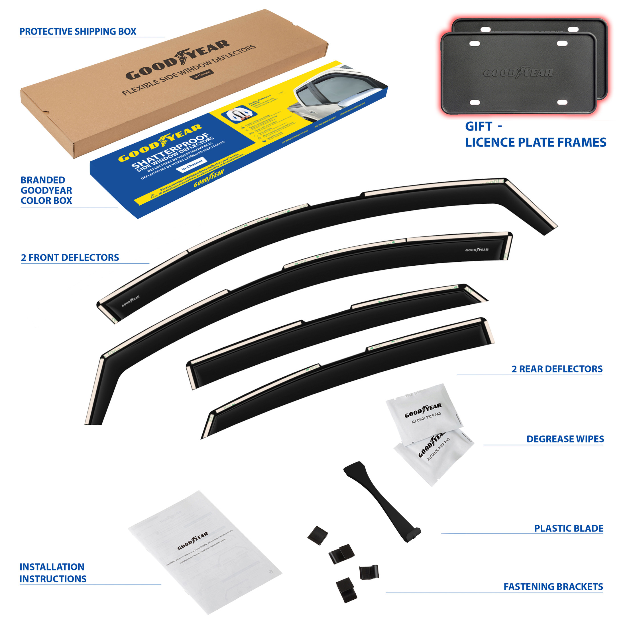 • PREMIUM GOODYEAR WINDOW DEFLECTORS let you roll your window down in rain, high winds, snow and ice. Keep you from getting wet while enjoying fresh air. Made of high quality, durable SHATTERPROOF material. Will not crack, break, or chip.